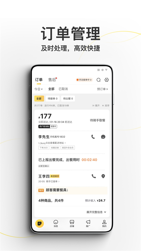 1、美团商家版下载app手机客户端处理退款、退单等问题,查看配送相关信息,流程清晰、便捷、高效。