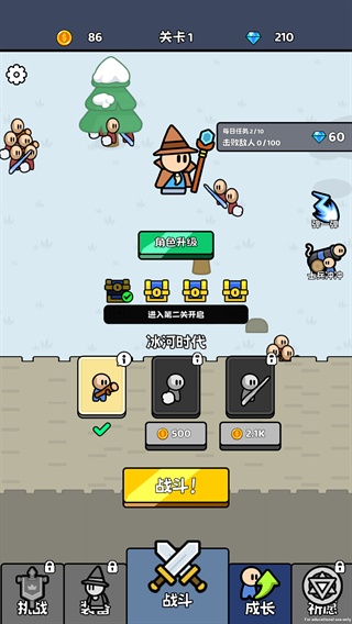 2、在游戏中完成教学任务,还能获得丰厚的奖励,在游戏中,敌人的种类很多,玩家们可以通过观看视频,获得更多的战士来为自己作战,在游戏结束之后,还可以消耗一些金币来提升自己的人物等级。