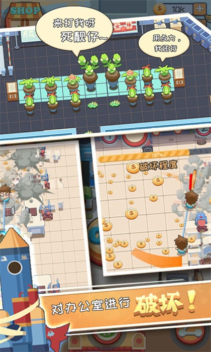 3、这款游戏采用了“揍老板”的模式,利用各种道具进行破坏,让玩家有一种身临其境的感觉。